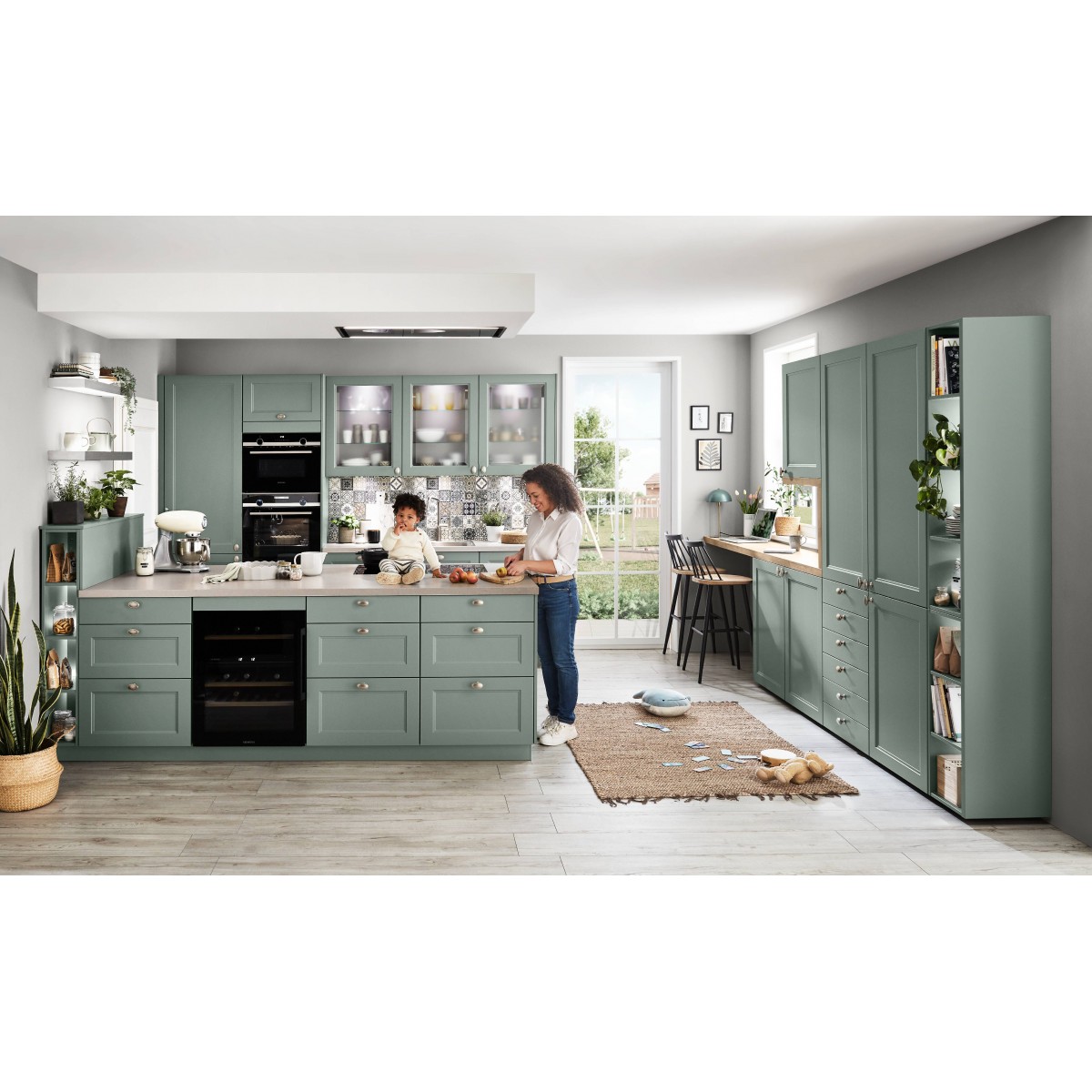 Un lugar en la naturaleza. Esta cocina combina la frescura del verde junco con la calidez del estilo de casa de campo moderna, creando un ambiente acogedor y sofisticado a la vez. La encimera decorada en piedra aporta carácter y serenidad, mientras los sutiles matices naturales evocan la tranquilidad del entorno rural.