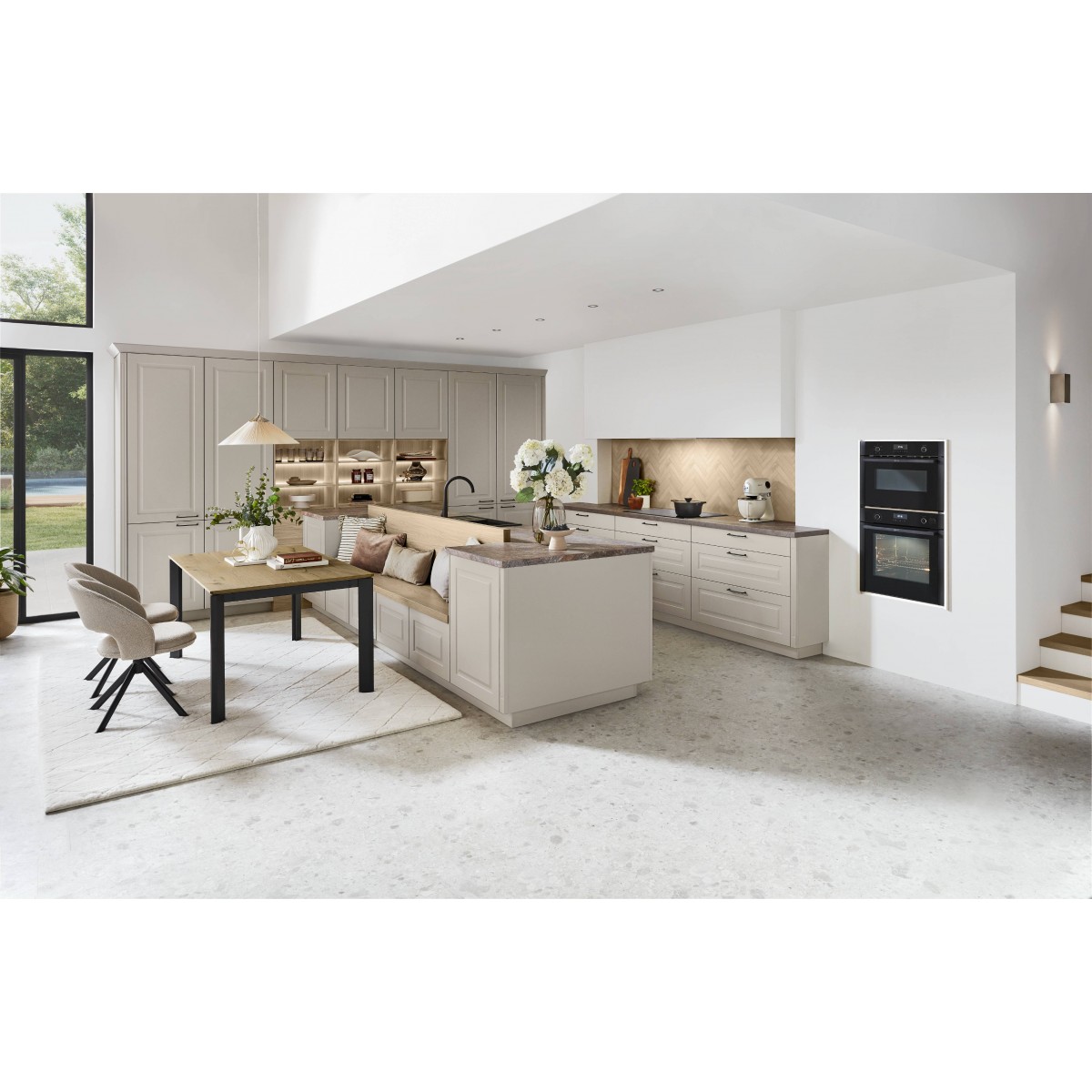 Los elementos en madera de aspecto roble se integran de forma armoniosa, transmitiendo calidez y conexión con la naturaleza. La zona de asientos acogedora completa el ambiente, invitando a relajarse, compartir y disfrutar de cada momento. Una cocina que combina tradición, diseño contemporáneo y una belleza natural que nunca pasa de moda.