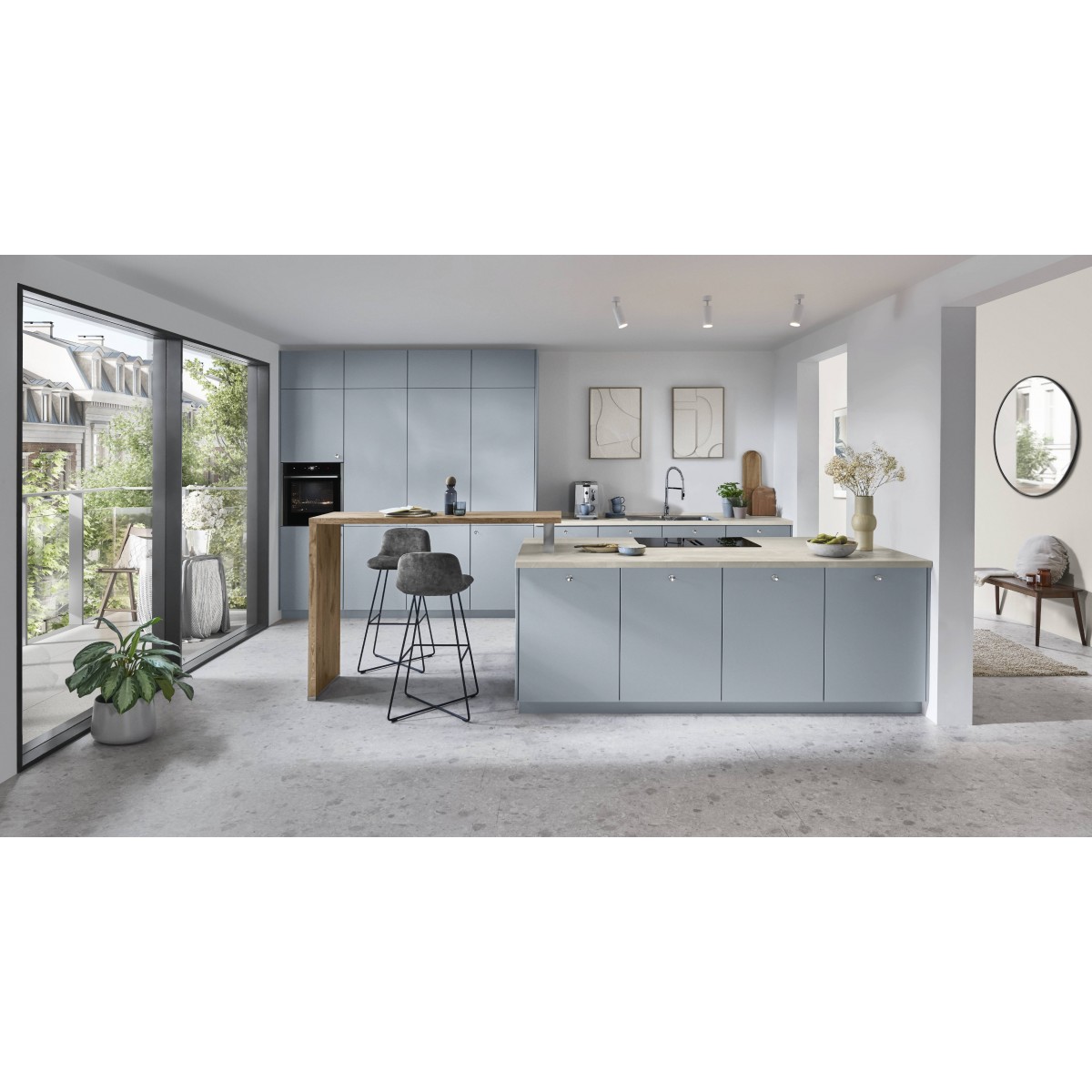Diseño interior inteligente. Una cocina que demuestra que el estilo no depende del tamaño. En este concepto, el delicado tono celeste pastel aporta luminosidad, serenidad y una sensación de orden gracias a su armonioso efecto tono sobre tono.